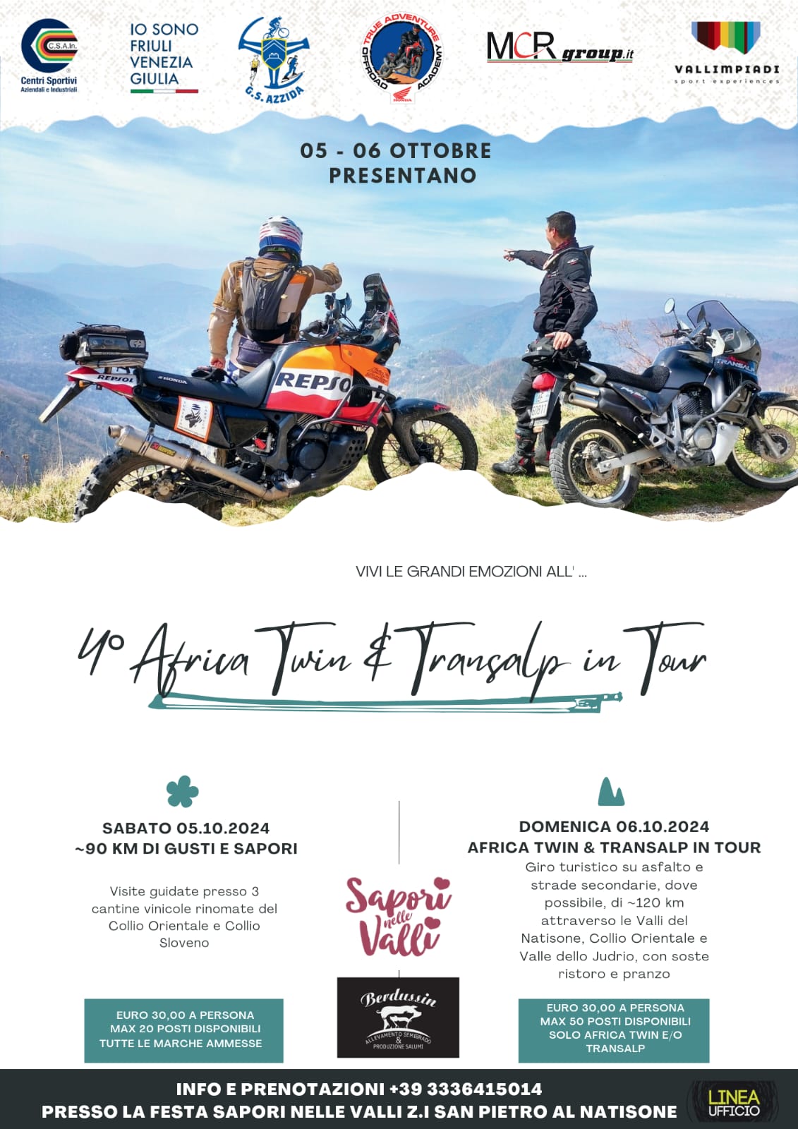 L’evento è in collaborazione con il 4° AFRICAN TWIN E TRANSALP TOUR, giro turistico con le due storiche moto, che partirà proprio domenica alle 9.30.